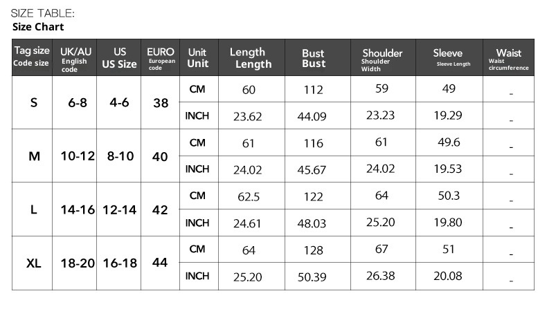 Note: 1. Asian sizes are 1 to 2 sizes smaller than European and American people. Choose the larger size if your size between two sizes. Please allow 2-3cm differences due to manual measurement. 2. Please check the size chart carefully before you buy the item, if you don't know how to choose size, please contact our customer service. 3.As you know, the different computers display colors differently, the color of the actual item may vary slightly from the following images.