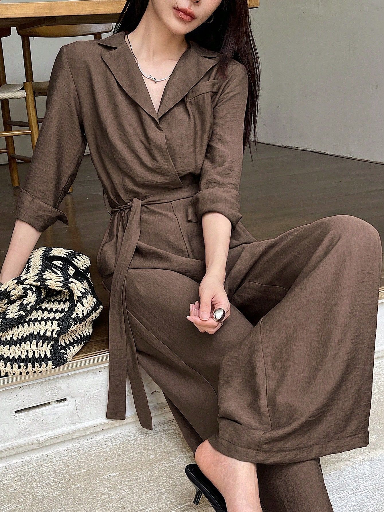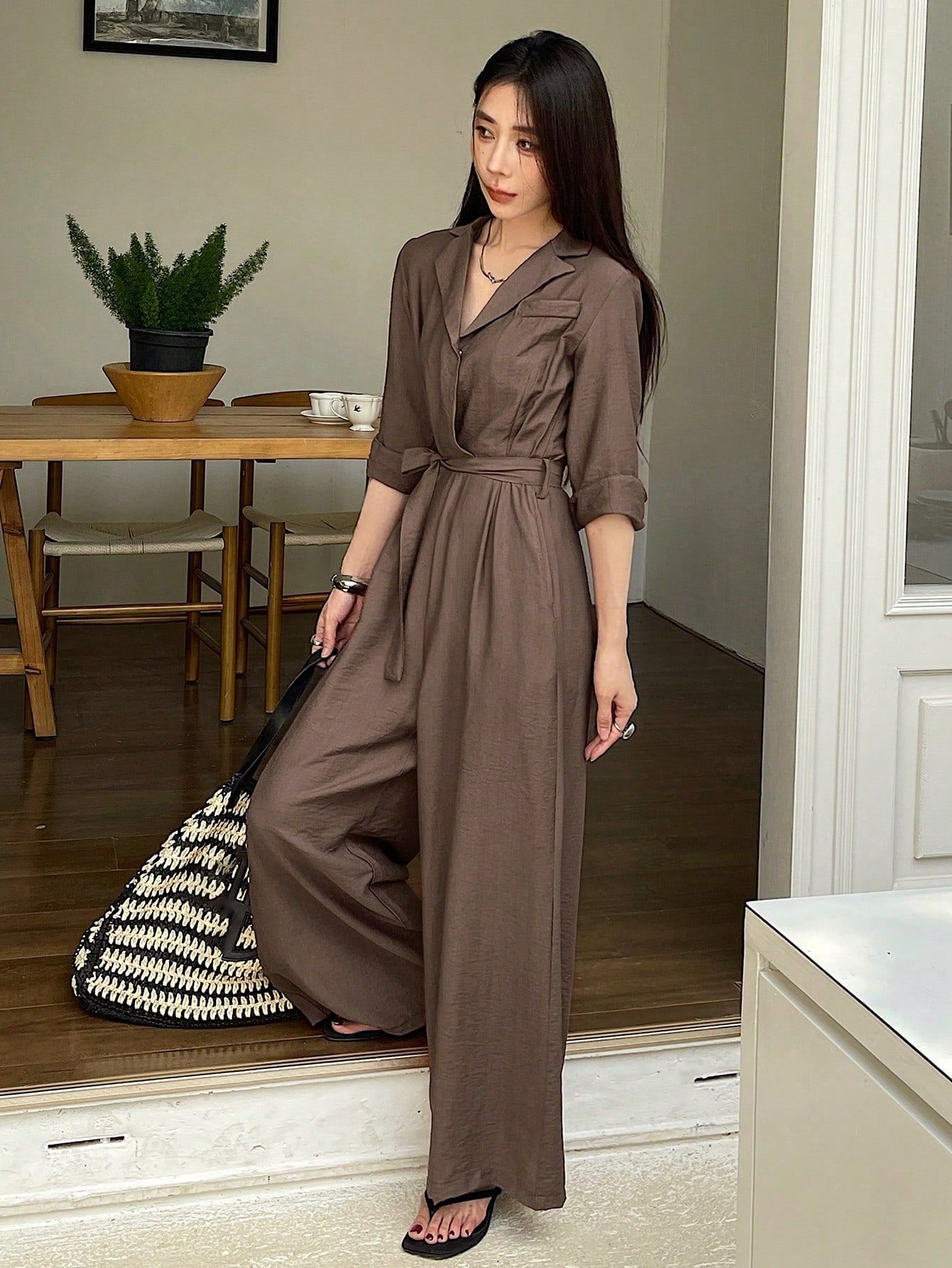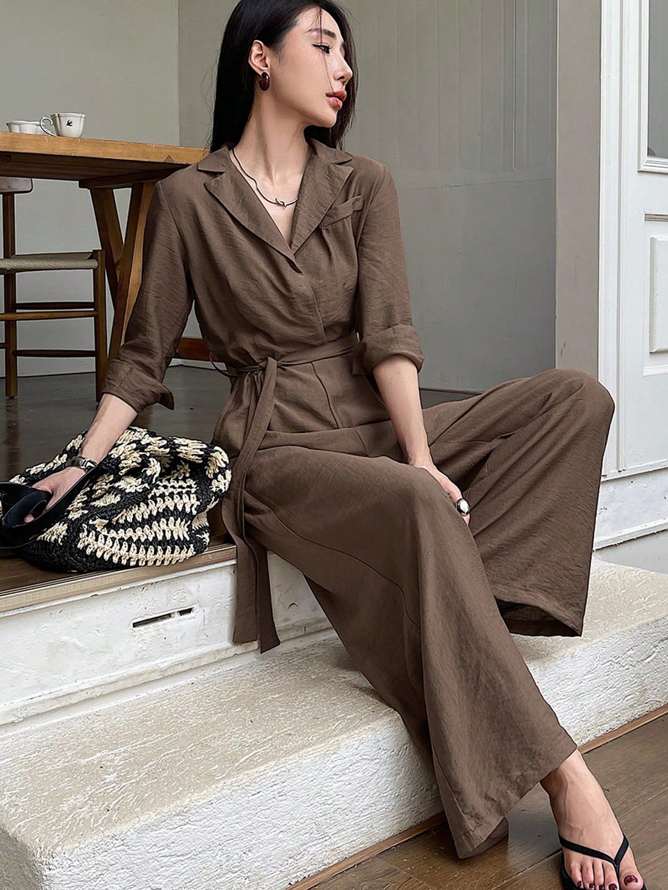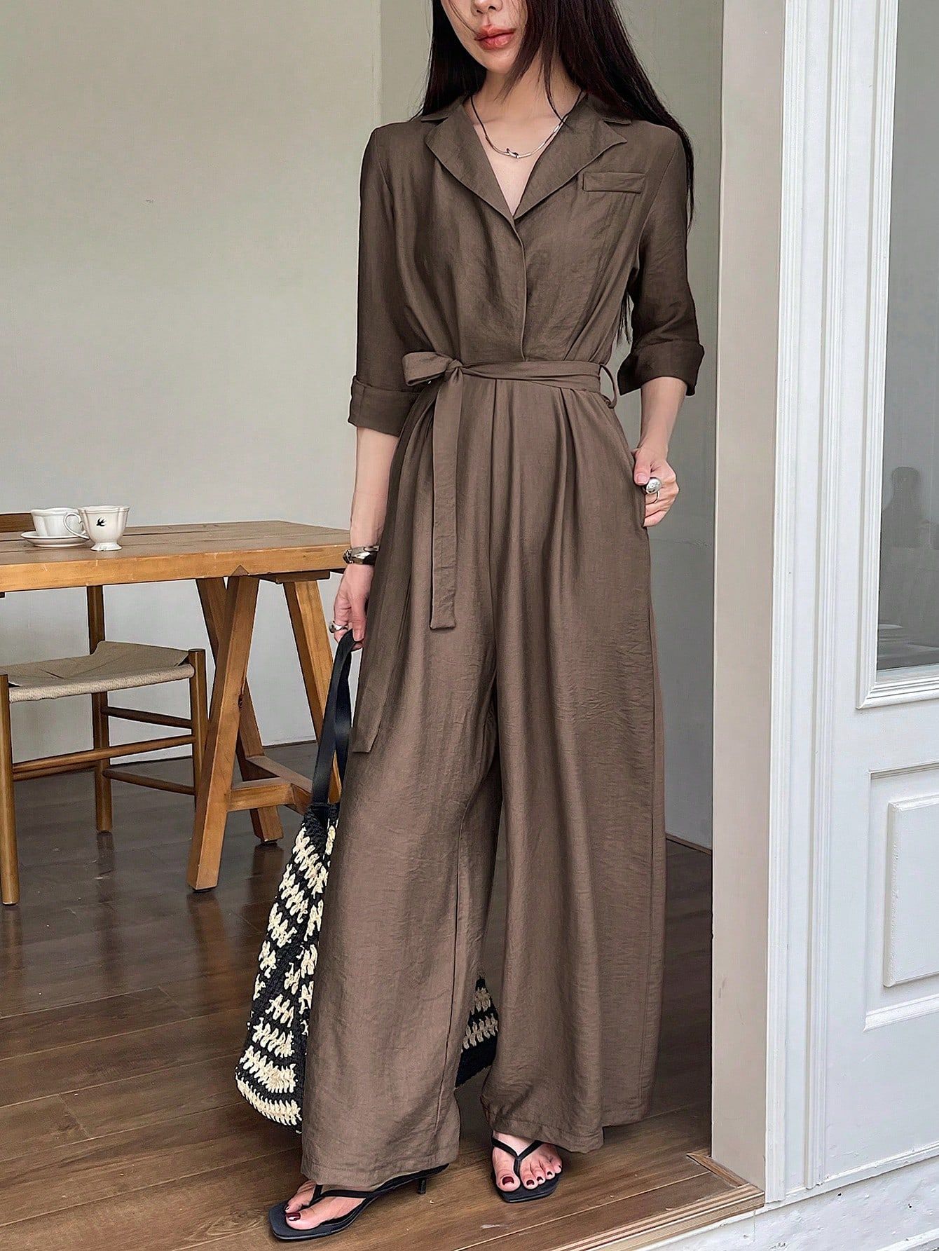 Elegant Solid-Color V-Neck Long-Sleeve Lace-Up Wide-Leg Jumpsuit