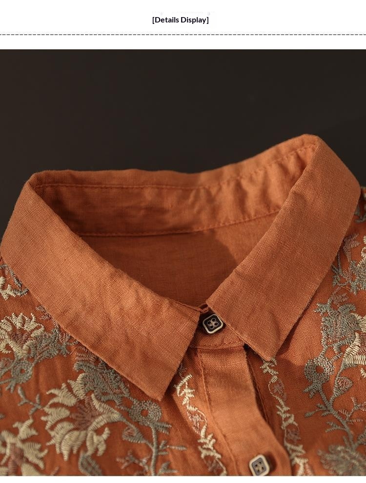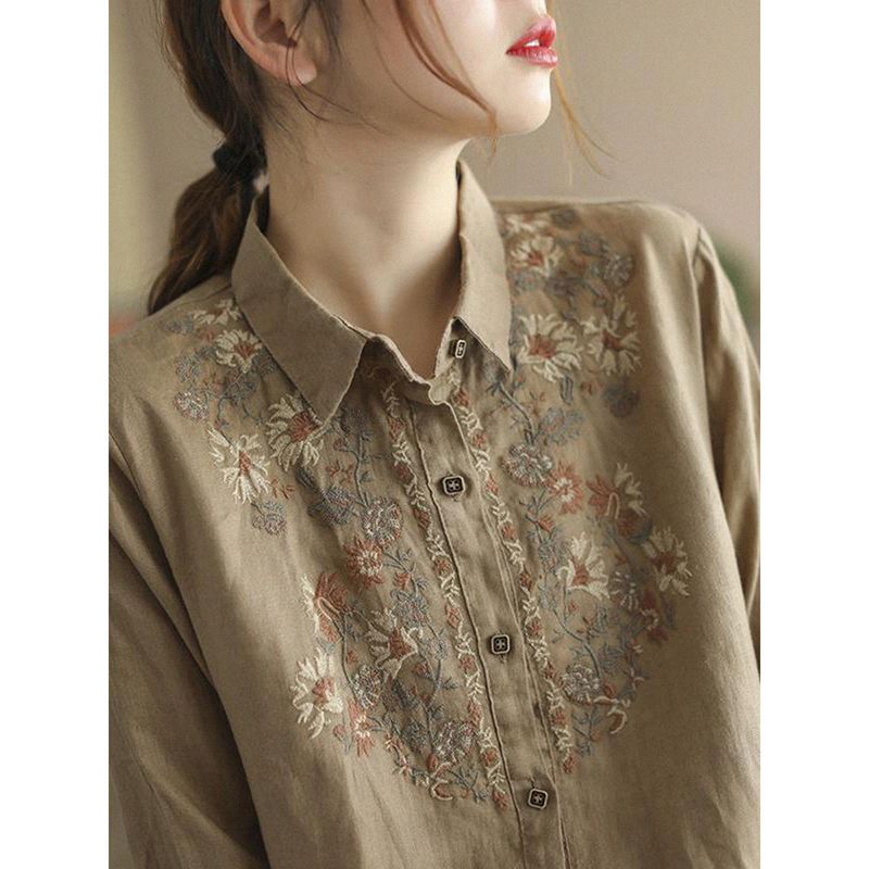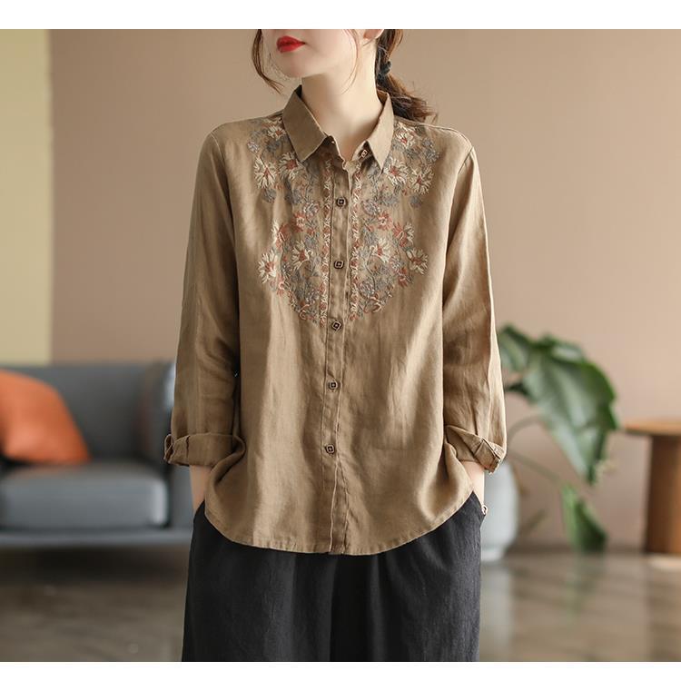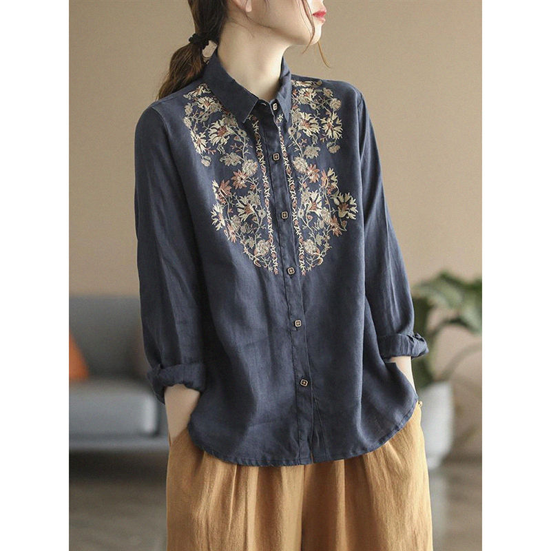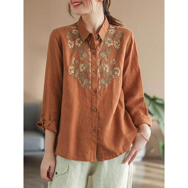 Womens Stylish, Loose-fitting Cotton-linen Long-sleeve Embroidered Shirt